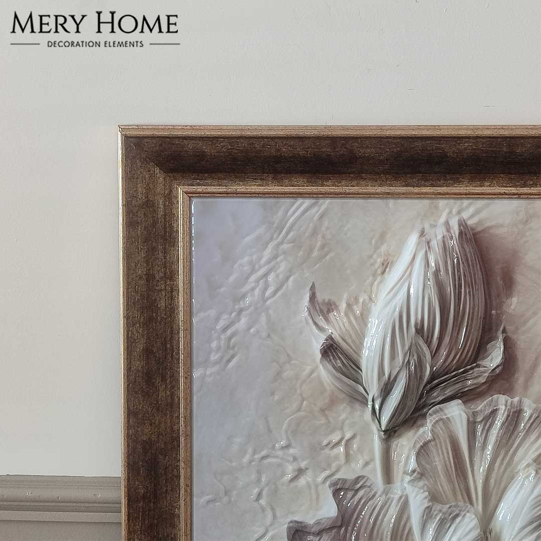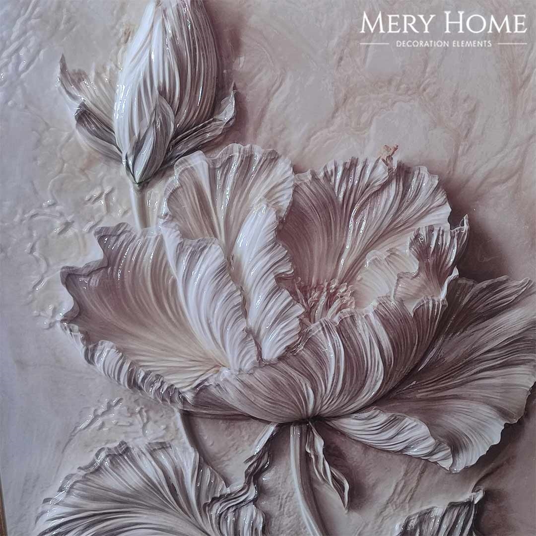 Açık tonlarda hazırlanmış yüzeyi ve dokulu zemin üzerinde yükselen çiçek formu, her dekorasyon stiline uyum sağlayabilecek kadar nötr; ama bir o kadar da dikkat çekici. Geleneksel çerçevesiyle klasik ve zamansız bir estetik sunarken, beyaz tonlarının baskınlığı sayesinde modern mekanlarla da mükemmel uyum sağlar.