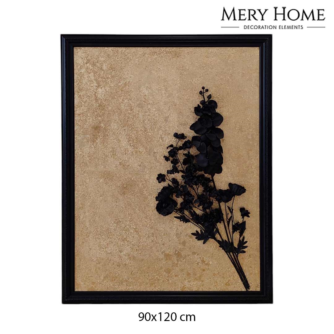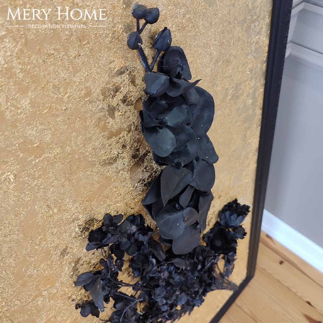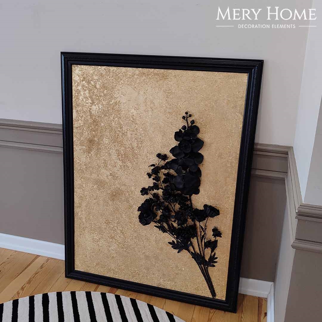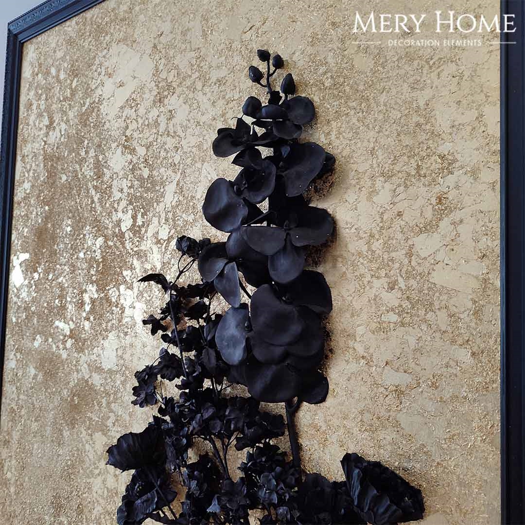 Tablonun en dikkat çekici özelliği, gerçekçi 3 boyutlu çiçek detayıdır. Siyah tonlarda işlenen çiçek, altın varak kaplama arka plan ile kontrast oluşturur ve ortaya derinlik hissi yüksek, göz alıcı bir sanat eseri çıkar. Desenli siyah çerçevesi, tabloya zarif bir bütünlük katarken mekânın atmosferini daha sofistike hale getirir.