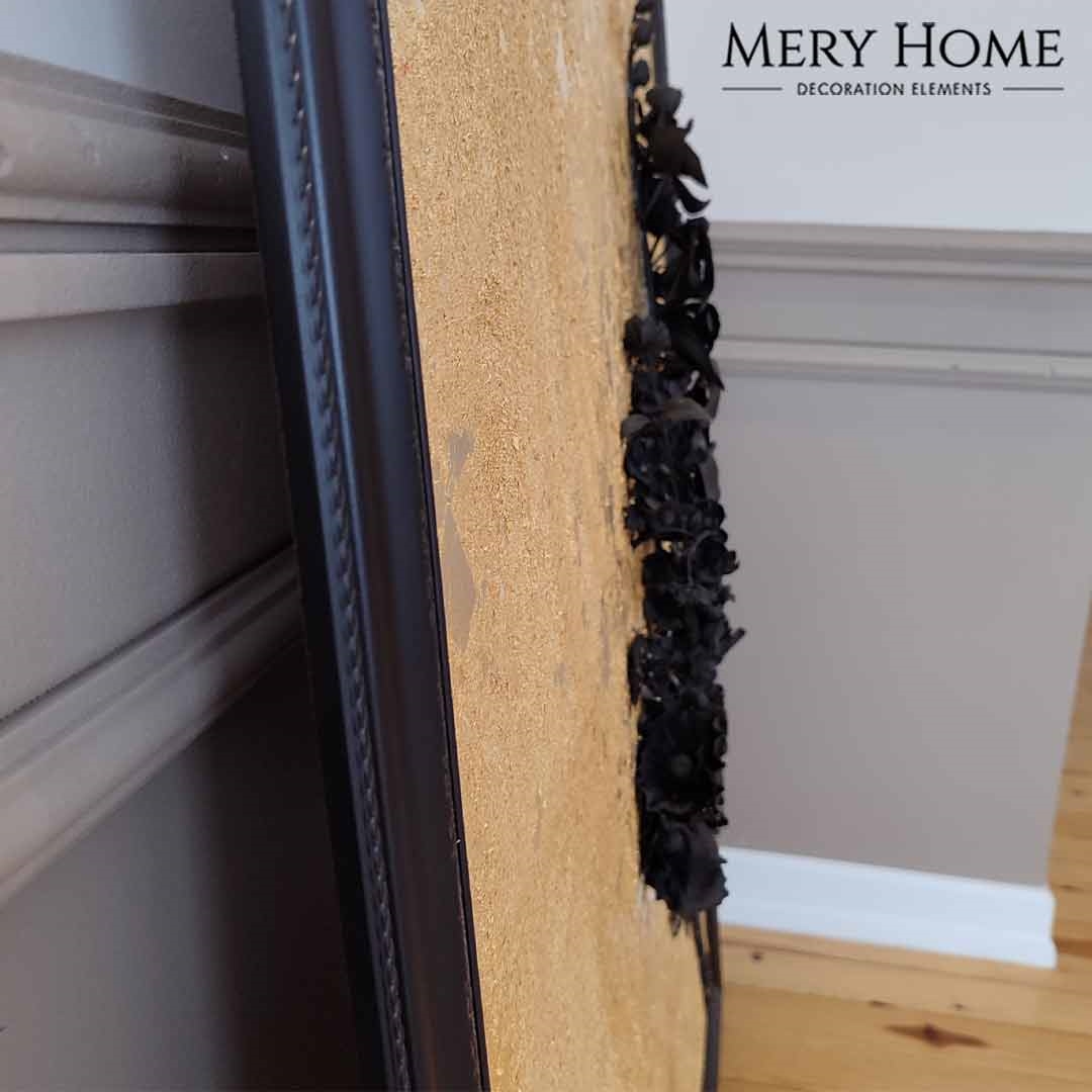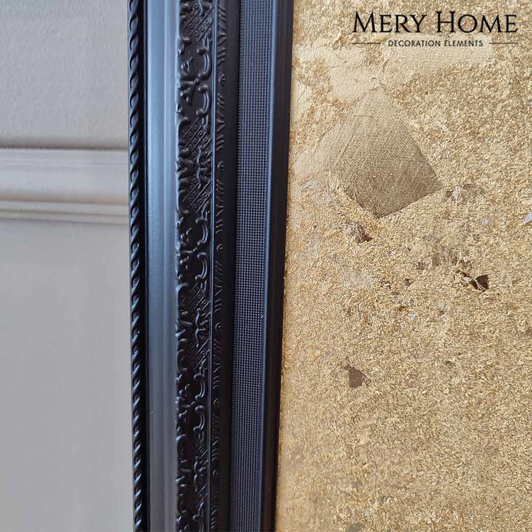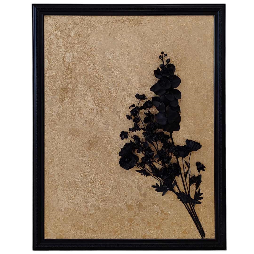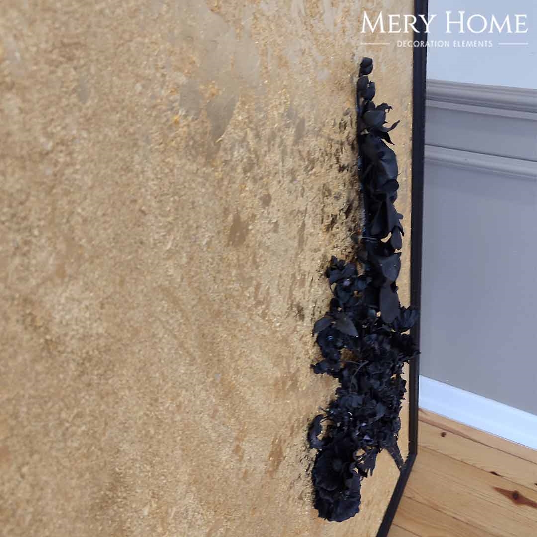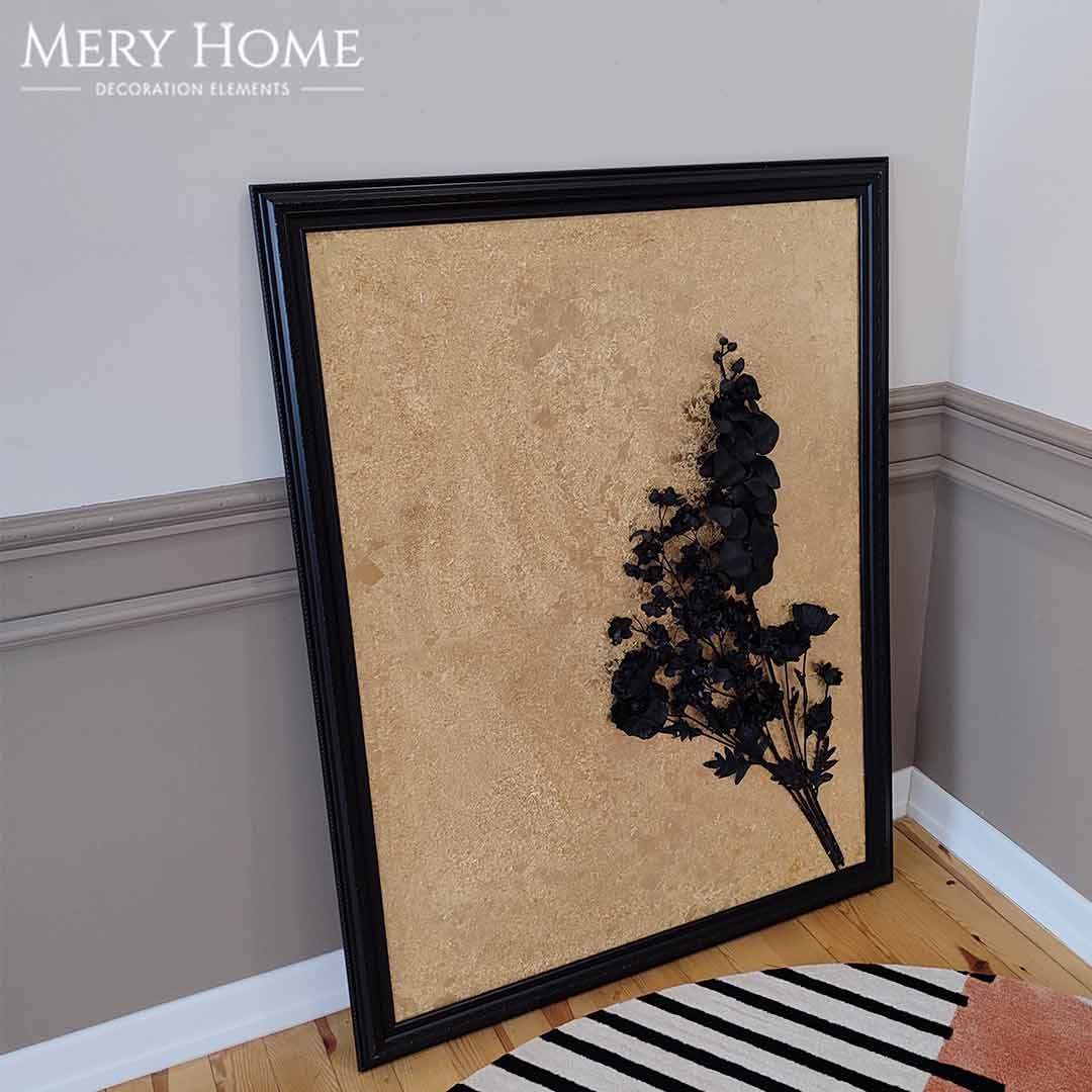 Tablonun en dikkat çekici özelliği, gerçekçi 3 boyutlu çiçek detayıdır. Siyah tonlarda işlenen çiçek, altın varak kaplama arka plan ile kontrast oluşturur ve ortaya derinlik hissi yüksek, göz alıcı bir sanat eseri çıkar. Desenli siyah çerçevesi, tabloya zarif bir bütünlük katarken mekânın atmosferini daha sofistike hale getirir.