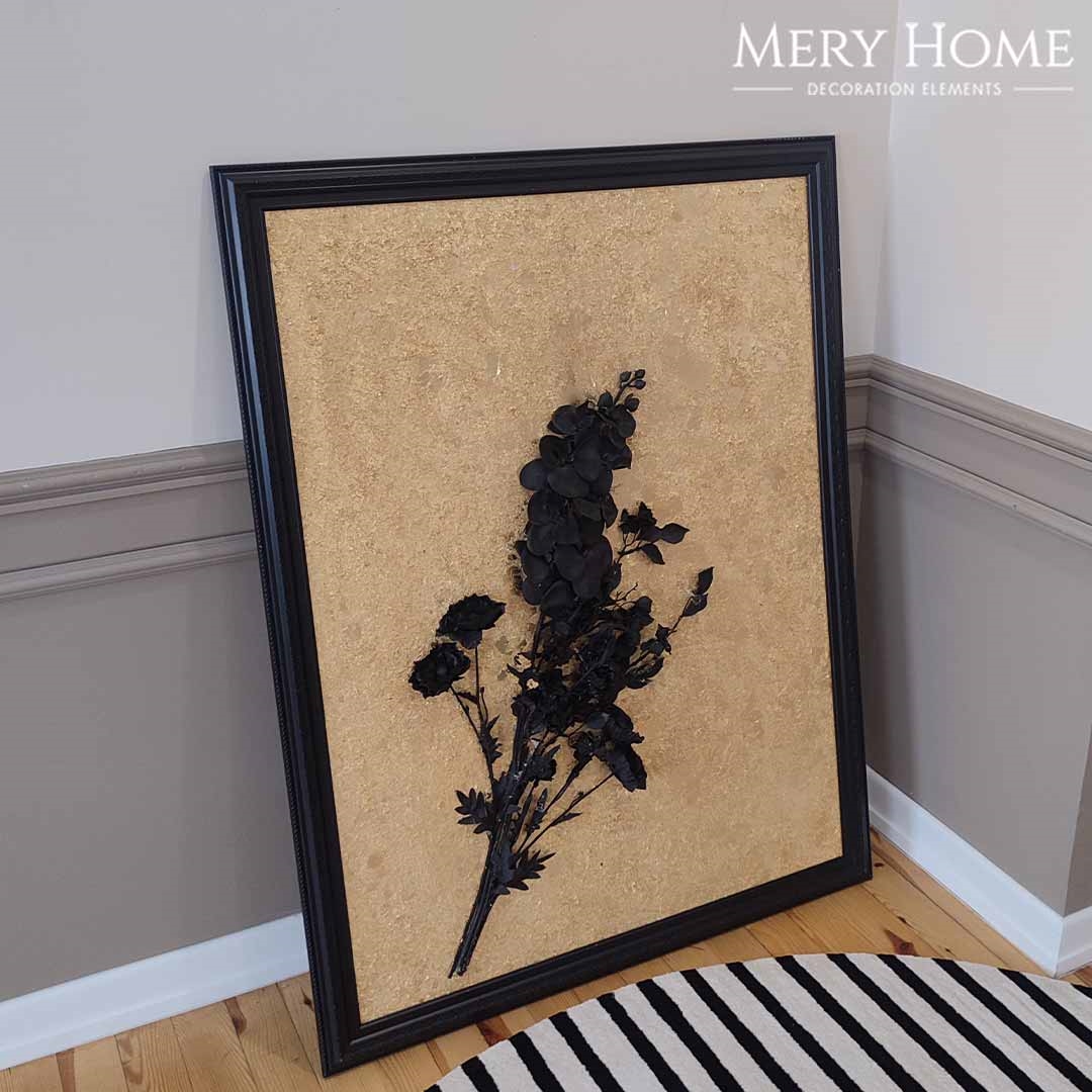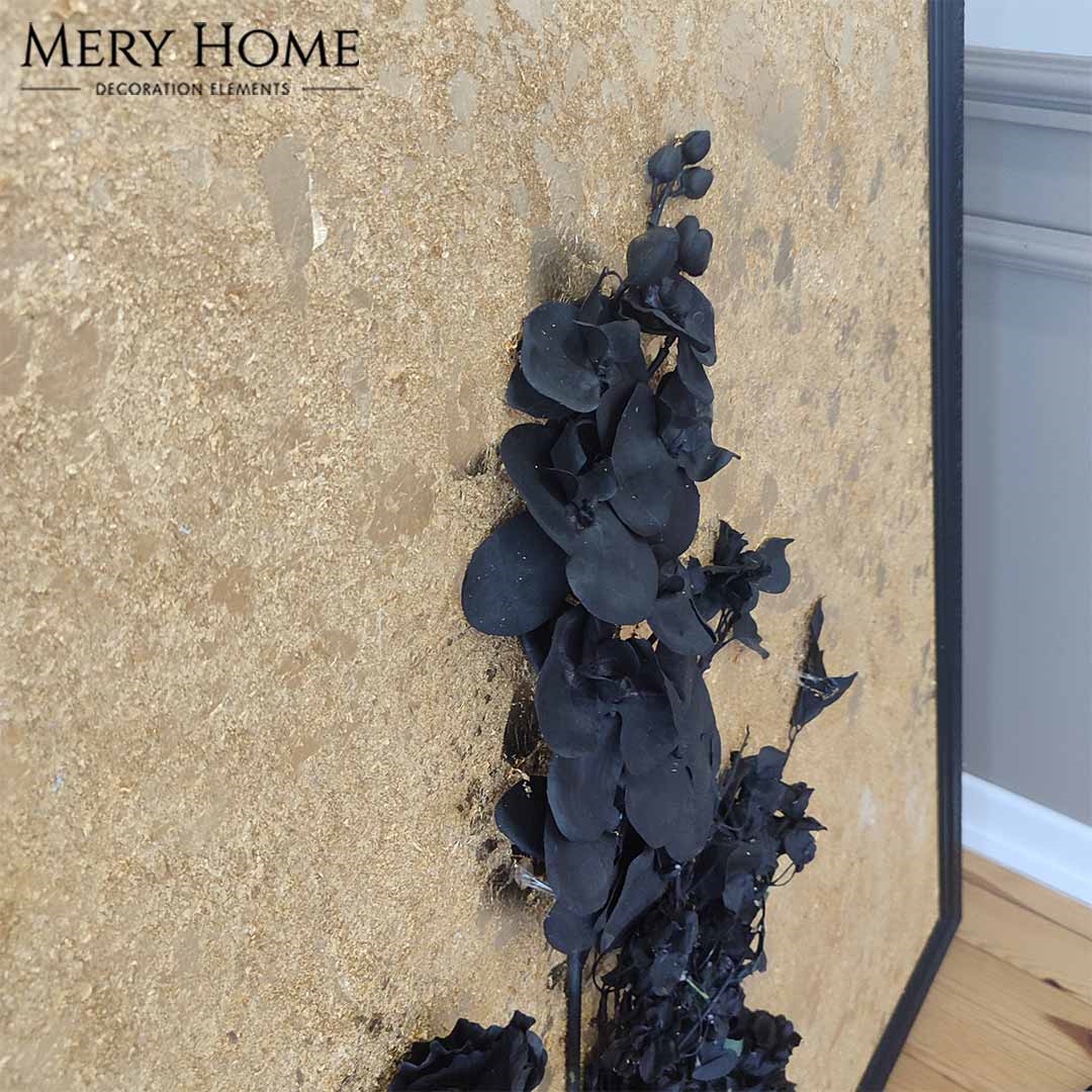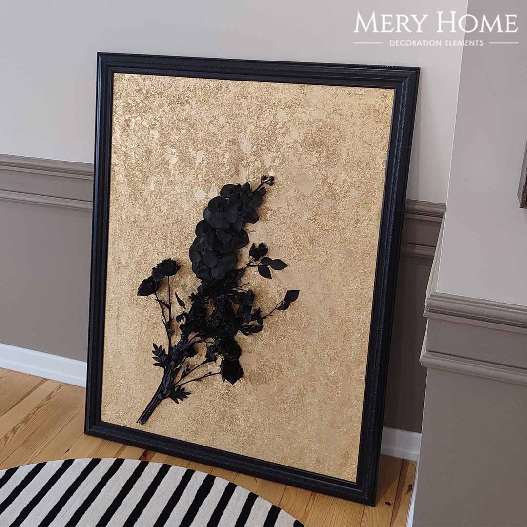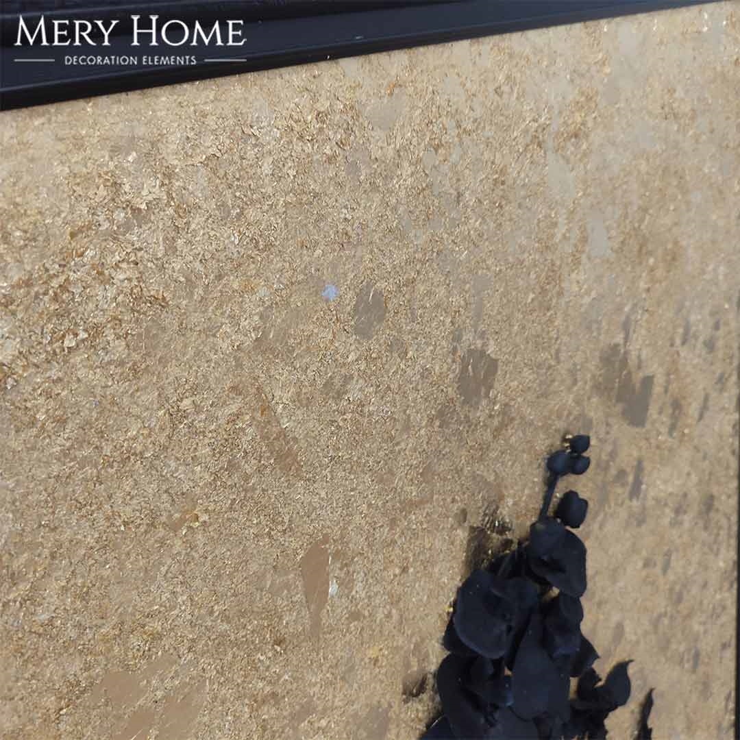 Tablonun en dikkat çekici özelliği, gerçekçi 3 boyutlu çiçek detayıdır. Siyah tonlarda işlenen çiçek, altın varak kaplama arka plan ile kontrast oluşturur ve ortaya derinlik hissi yüksek, göz alıcı bir sanat eseri çıkar. Desenli siyah çerçevesi, tabloya zarif bir bütünlük katarken mekânın atmosferini daha sofistike hale getirir.