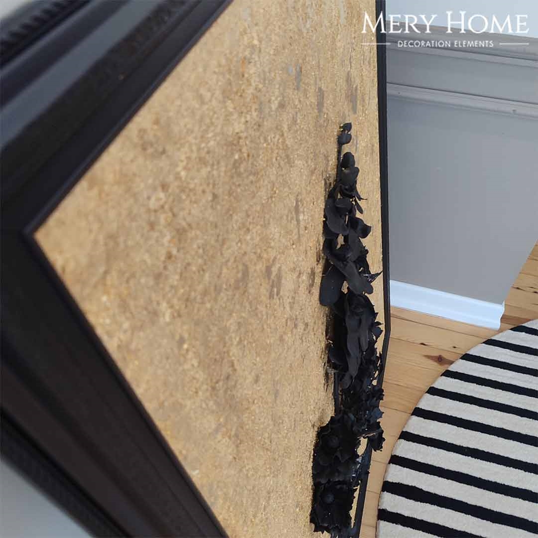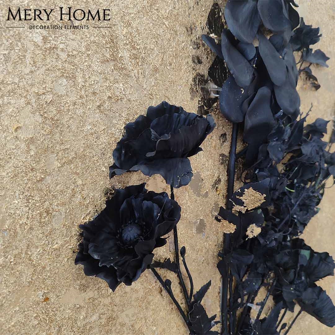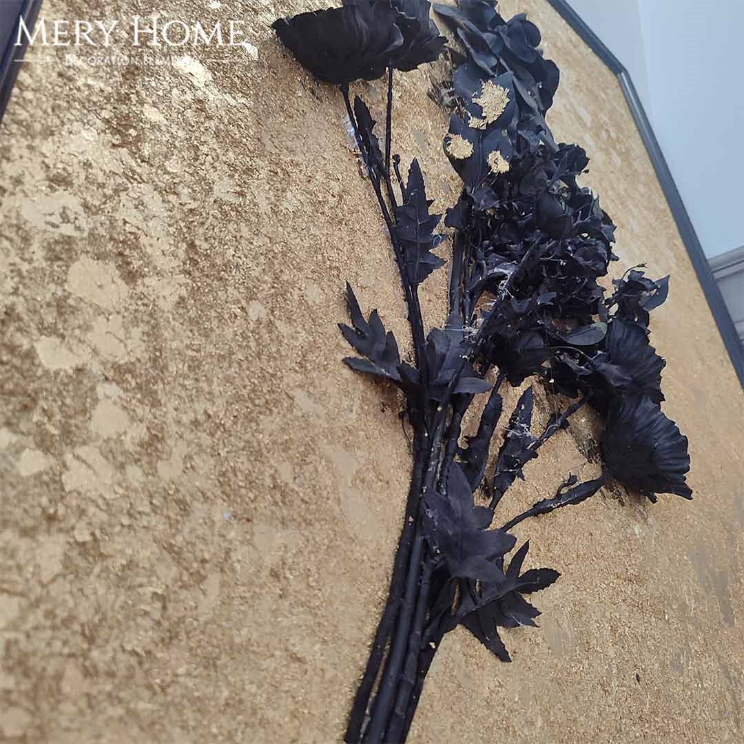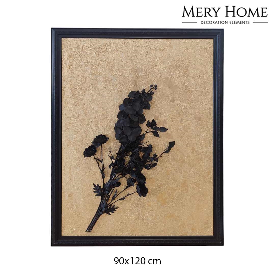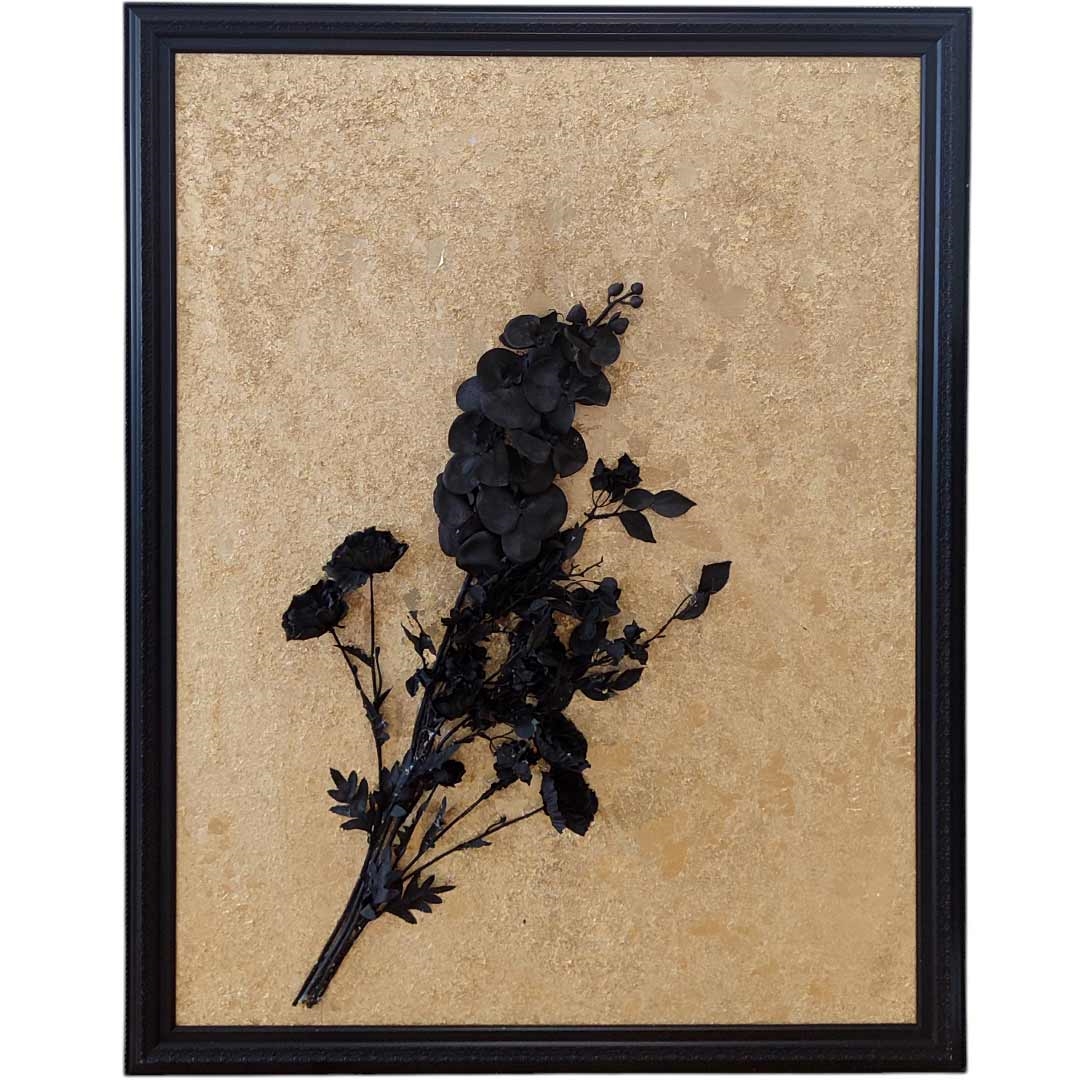 Tablonun en dikkat çekici özelliği, gerçekçi 3 boyutlu çiçek detayıdır. Siyah tonlarda işlenen çiçek, altın varak kaplama arka plan ile kontrast oluşturur ve ortaya derinlik hissi yüksek, göz alıcı bir sanat eseri çıkar. Desenli siyah çerçevesi, tabloya zarif bir bütünlük katarken mekânın atmosferini daha sofistike hale getirir.