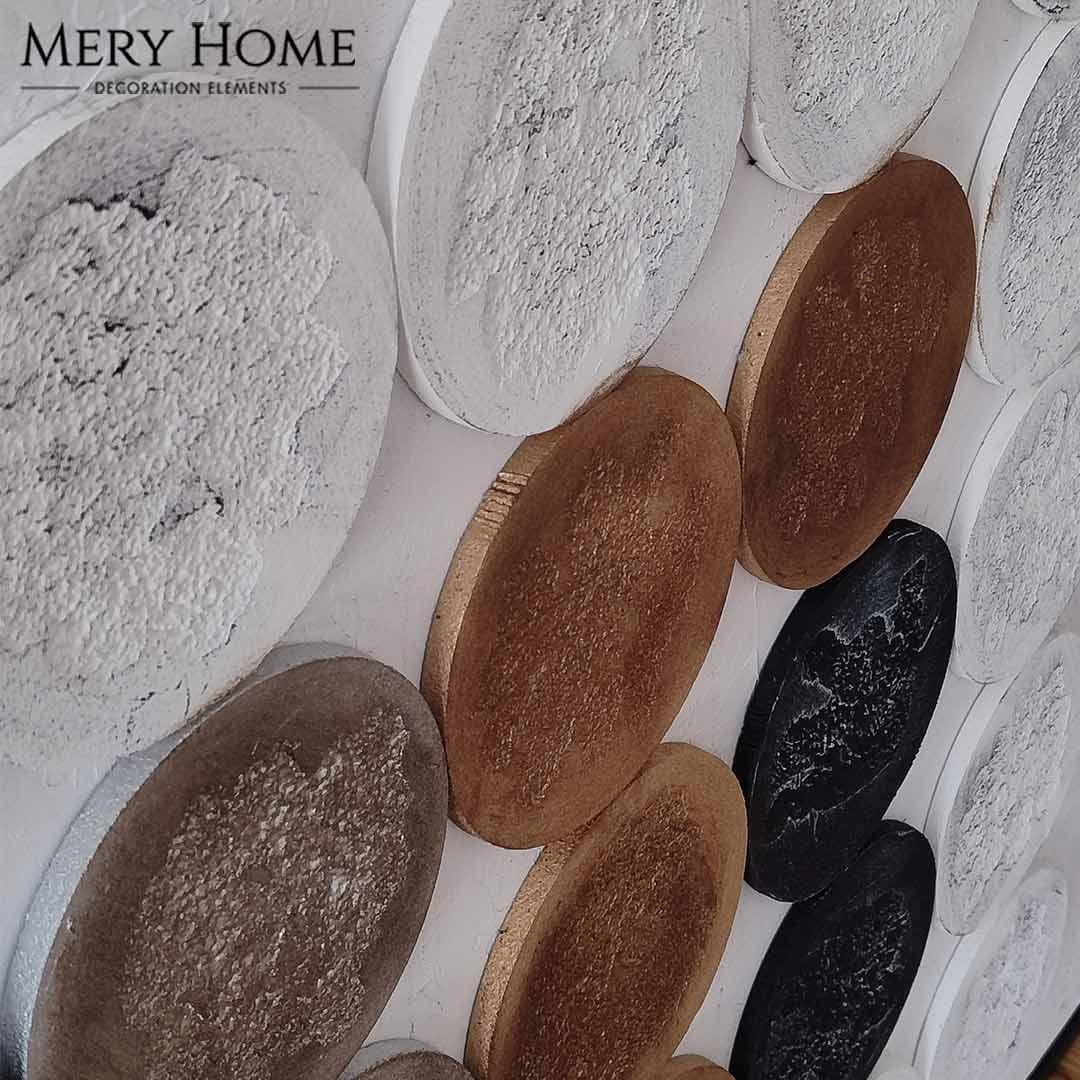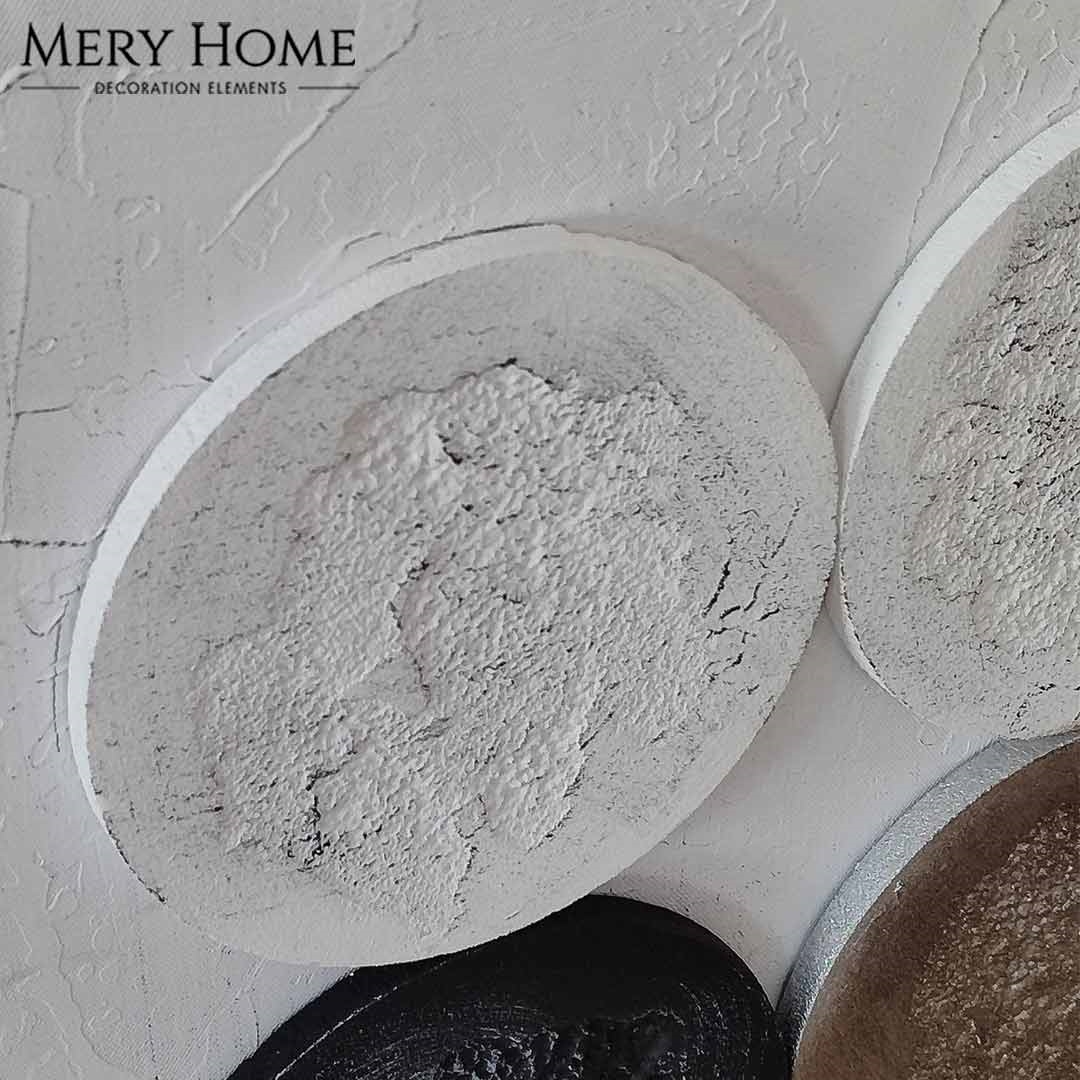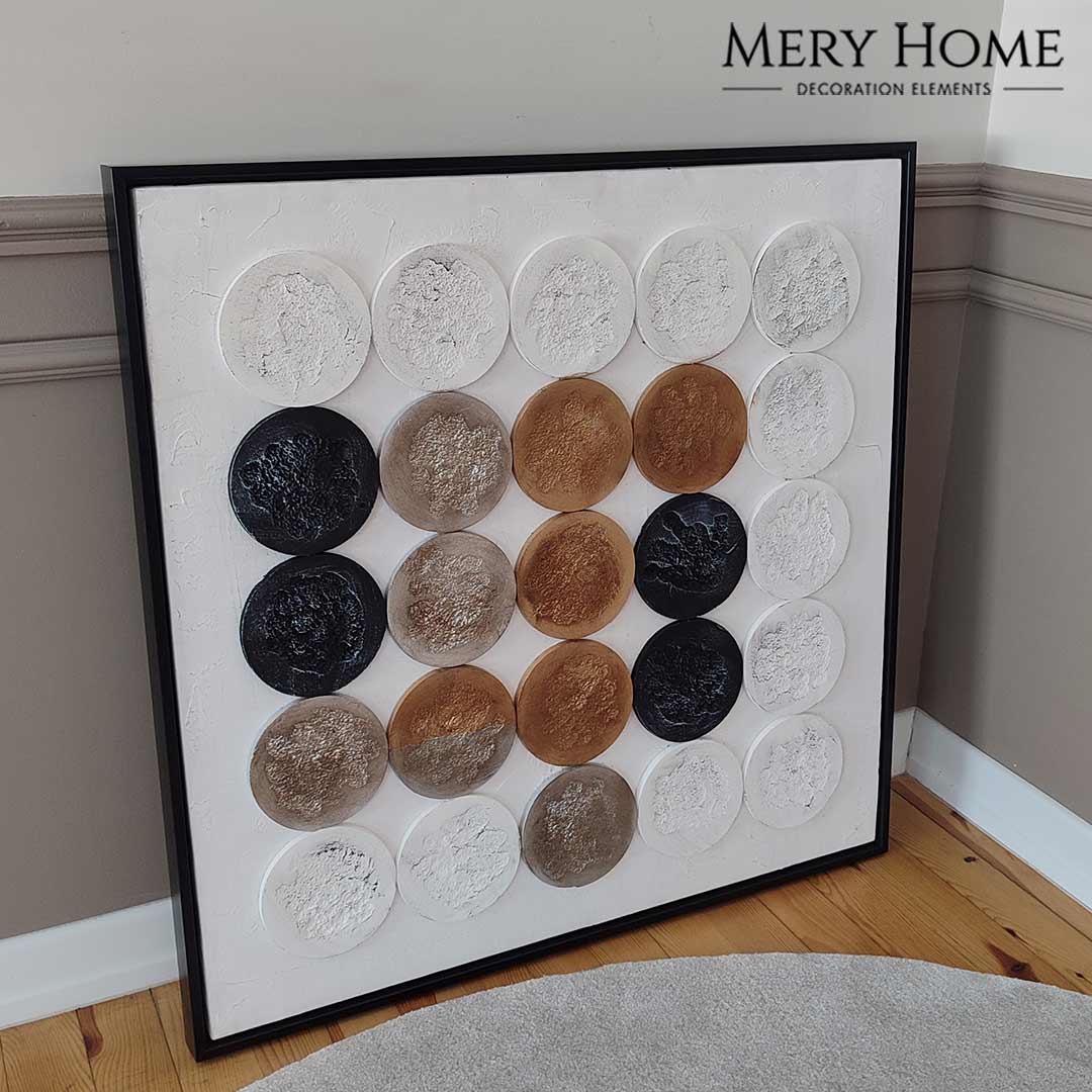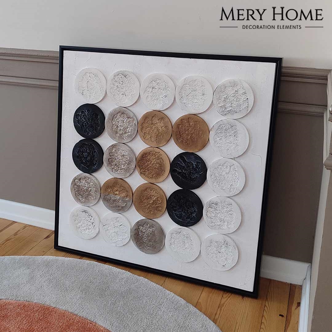 Bu etkileyici 94x94 cm boyutlarındaki el yapımı kabartmalı tablo, mekanınıza modern ve sofistike bir dokunuş katacak. Her biri özenle işlenmiş dairesel formlar, yüzeyde üç boyutlu bir derinlik ve zengin bir doku hissi yaratır.