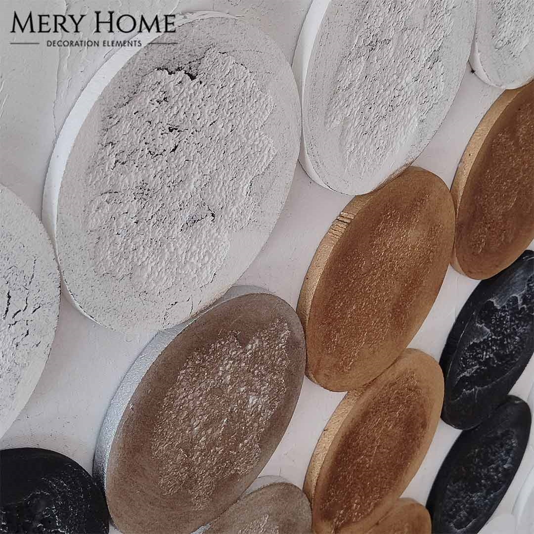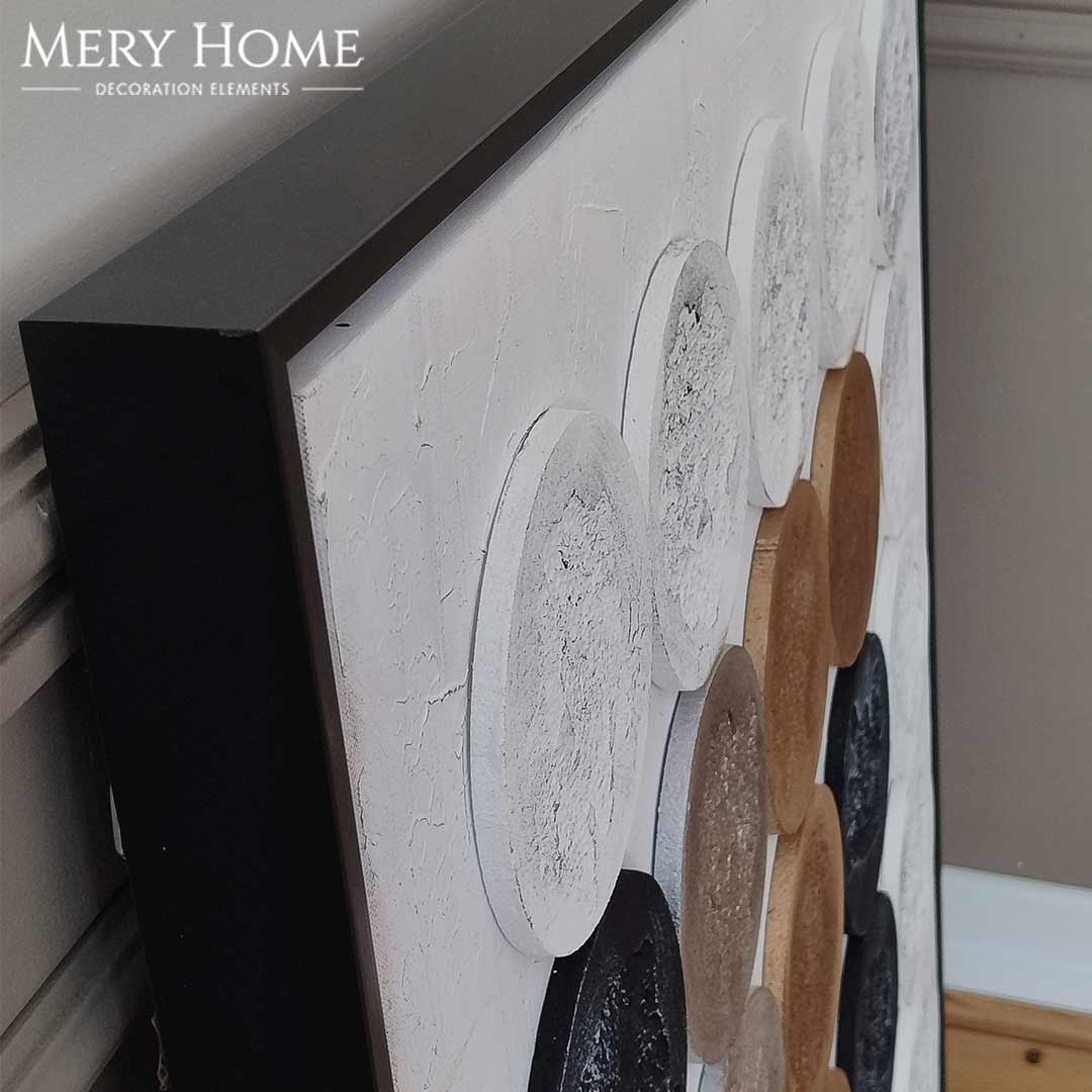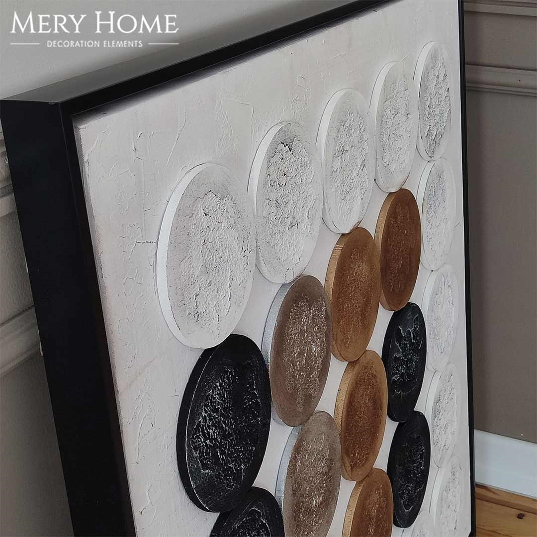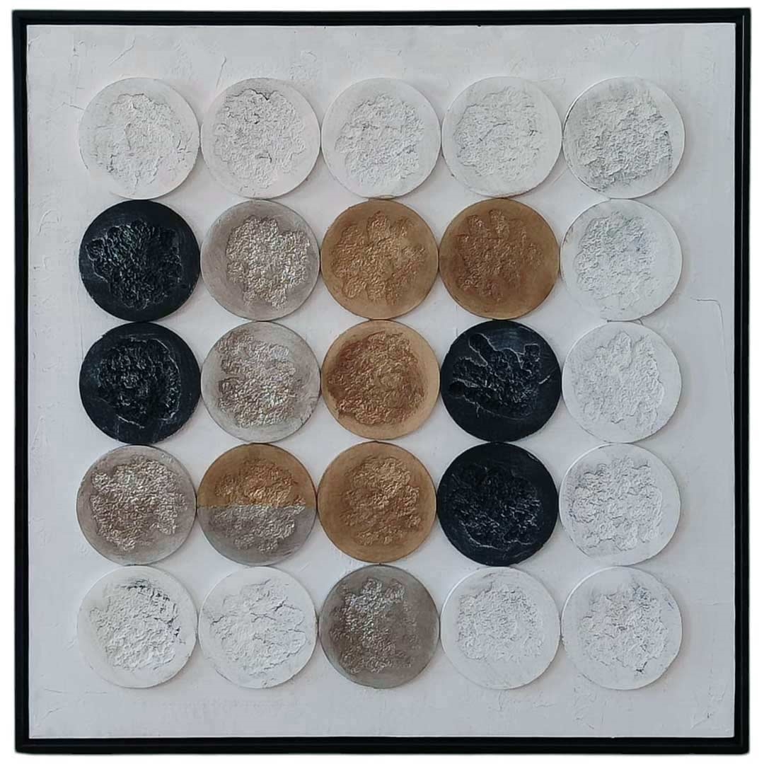 Tabloda kullanılan renk paleti, siyahın gücünü, beyazın saflığını ve bej/altın tonlarının sıcaklığını bir araya getirerek dengeli ve şık bir görünüm sunar. Her bir dairenin kendine özgü kabartma deseni, ışığın geliş açısına göre farklı gölgeler oluşturarak esere dinamik bir hareketlilik katar.